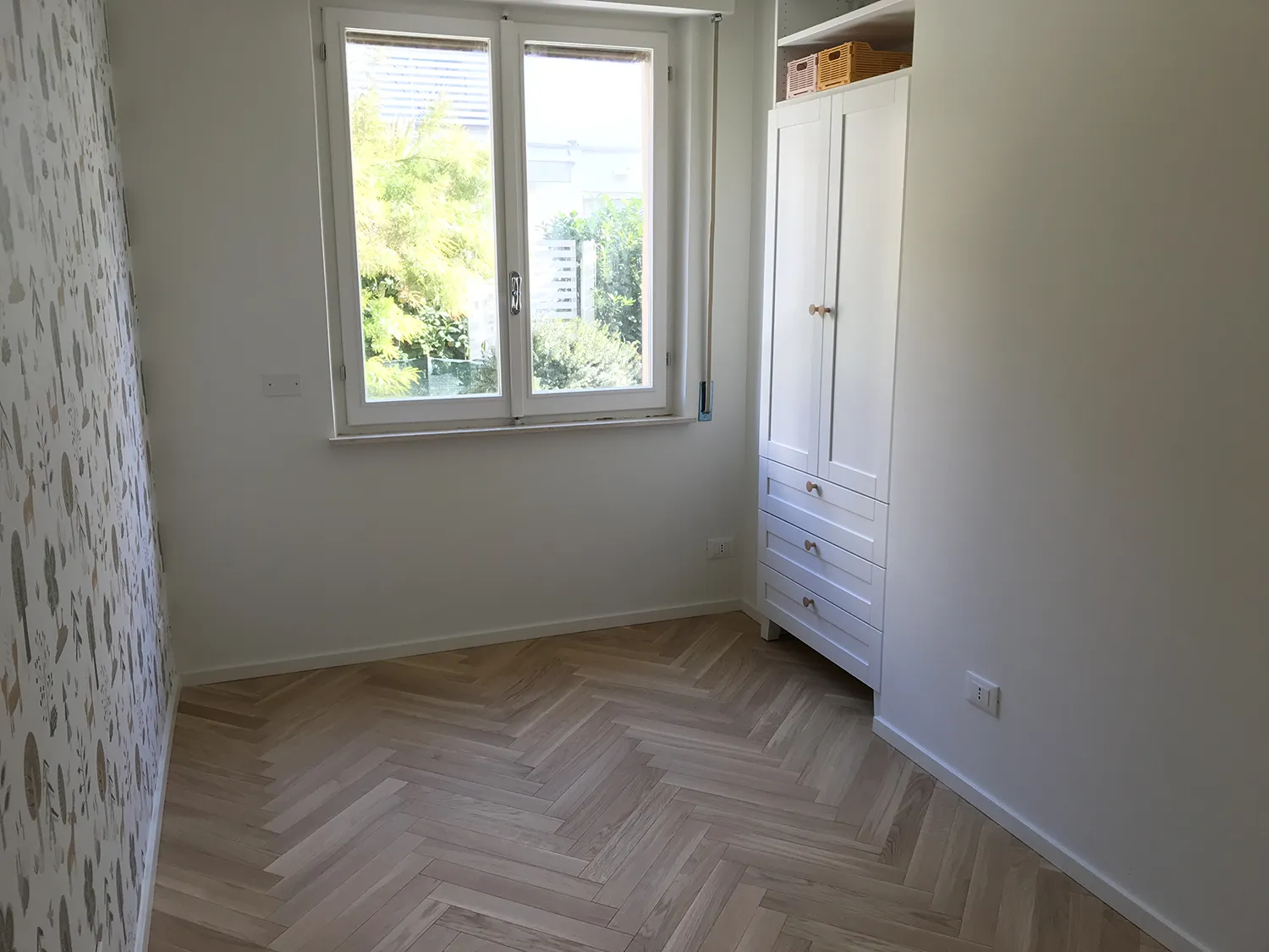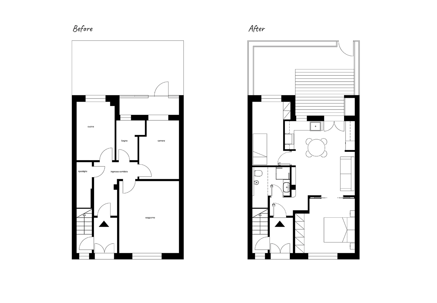 We initially thought of keeping the bathroom in the same position for budget reasons but we didn't like the solutions because we would have had a passageway room, a room that was too large and we wouldn't have had a living room instead. So we decided to move the bathroom to the darkest area of the house, namely the understairs and part of the corridor. For us it was very important to have the perception of a bright and large space despite the few square meters available. We therefore chose to open a large double sliding door between the bedroom and the living room, to put the two environments in maximum contact. We also created a living area overlooking the garden.