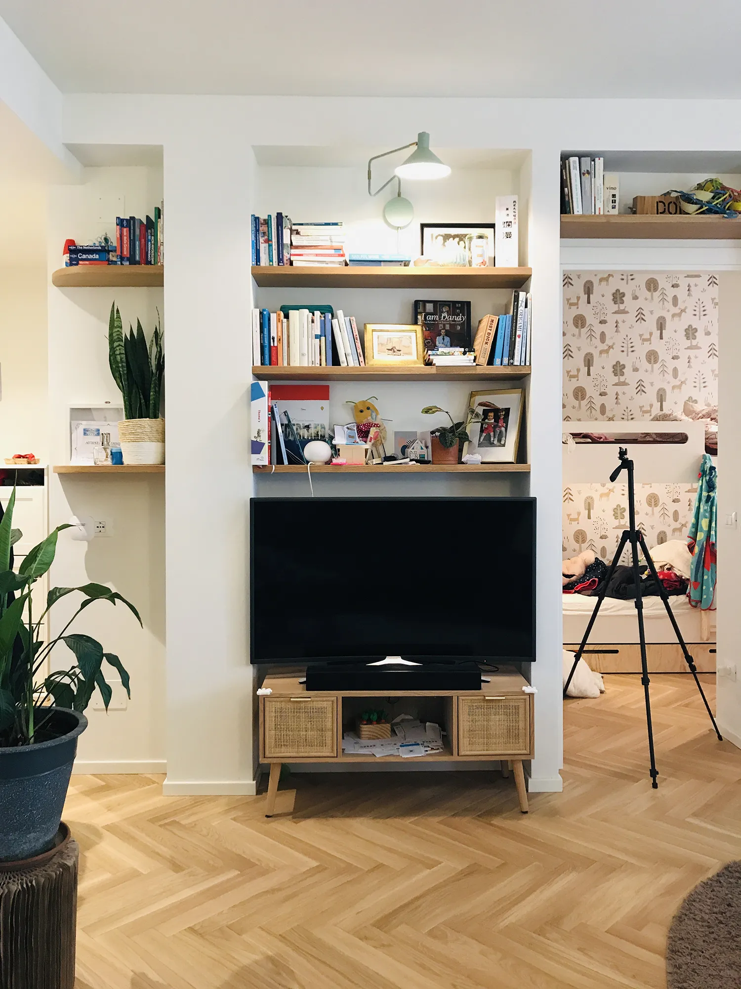 The creation of niches to build in the kitchen as well as the TV corner makes the space extremely clean and organised. The main wall thus becomes an element rich in designed and well-proportioned details, where everything has its place.
