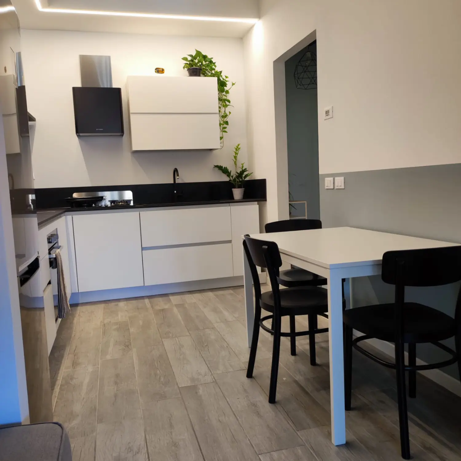 S ha scelto una soluzione funzionale molto simile a quella proposta da lei nella prima telefonata, ovvero spostare la cucina dall’attuale veranda al soggiorno esistente, mantenere la camera matrimoniale e utilizzare la seconda camera come stanza jolly per il tempo libero, la pratica dello yoga e l’angolo creativo.