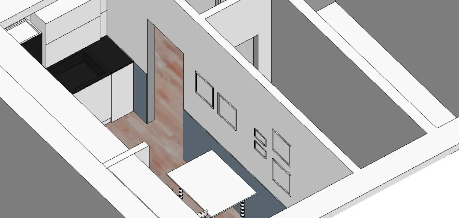 Abbiamo lavorato insieme a più soluzioni per la disposizione degli spazi, dell’illuminazione e la palette dei colori. Le scelte sono sempre state di S, mentre il mio ruolo è stato di fornirle gli strumenti giusti per poter decidere (schizzi, viste 3d, prove colore, etc.). Una cosa importante, con S abbiamo lavorato online!